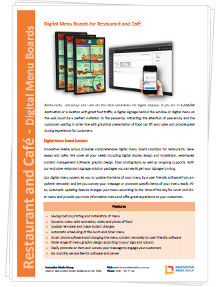 Innovatve Media Group provides comprehensive digital menu board solutions for restaurants, takeaways and cafes. We cover all your needs including digital display design and installation, web-based content management software, graphic design, food photography as well as on-going supports. With our exclusive restaurant signage solution packages you can easily get your signage running.